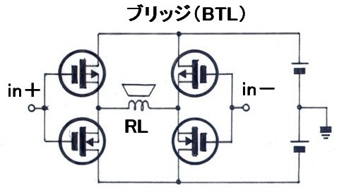 このブリッジ(BTL)接続での注意点は負荷抵抗であるスピーカー( RL )はフローティング状態であり、片側はアース出来ない事です、