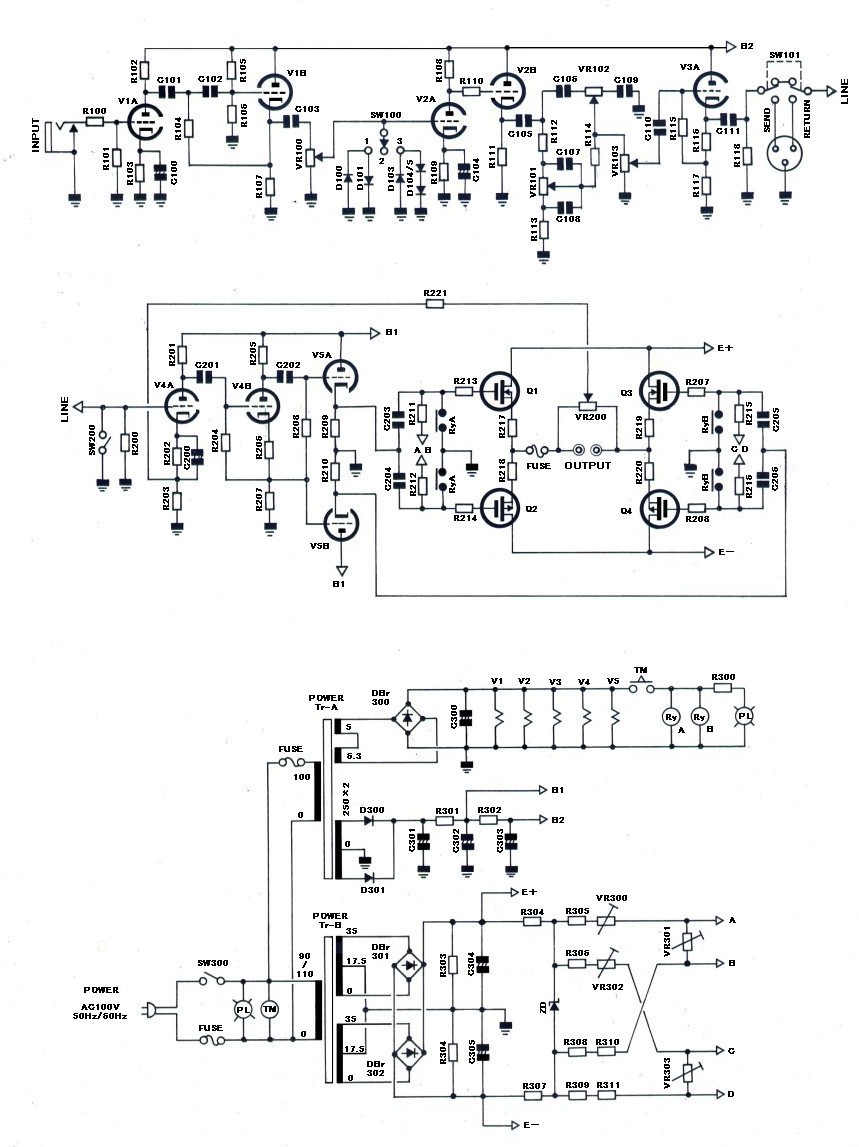 100Wクラスでは、出力管にはKT88によるプッシュプル(2本)は最低限必要です、6L6GCやEL34を用いるならパラレル・プッシュプル(4本)が必要となります、100W以上の出力となると汎用の出力トランスでは不可能で特注品を採用せざるを得ません。