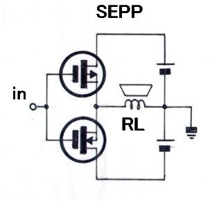 このFETでSEPPの回路だけでも出力段として十分働きます、通常の出力回路であれば大きな問題はありません、しかし大出力アンプでは大きな電力を扱います、SEPPの動作はシングル・エンデット・プッシュプルでプッシュプルでありながらシングル動作であり電源と直列の関係にあります、したがって電源のグレードは音に直接関係してまいります、出力が大きい程グレードの高い電源を必要とします、これを回避するにはSEPPの回路を2組み用意し正相、逆相、として動作させブリッジとします、これにより電源のグレードは表に出て来ません、大出力の回路であっても簡易的な電源規模で済みます。