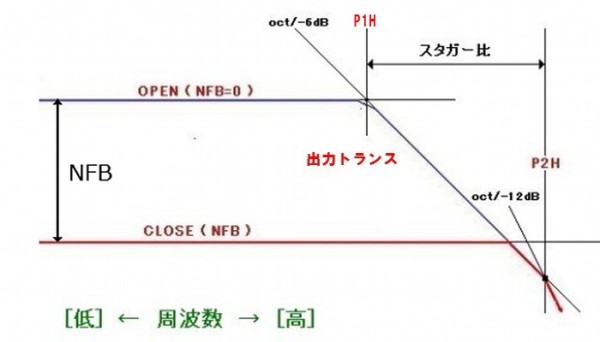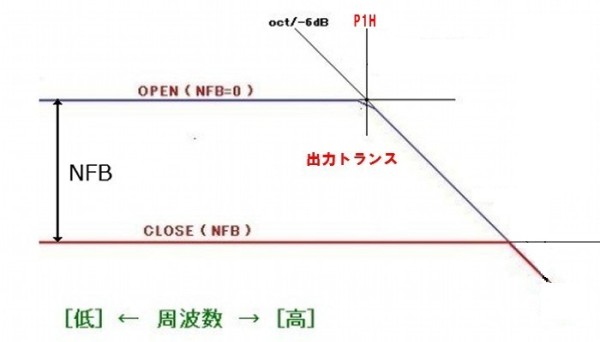 高速、高負帰還を実現する場合、出力トランスを高域ポール、P1Hに設定に設定する必要があります、